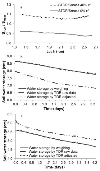 Total water storage measured through weighing every hour was over or under estimated when calculated from TDR measurements. It is known that the default equation given by Reference [39] that relates both parameters is not exactly valid for any particular soil, and that a specific soil calibration may become necessary. It was assumed that the error of the TDR-measured soil water content was systematic and not constant but changing over the range of moisture conditions. Therefore, in order to minimize the error, water content values measured by TDR probes were adjusted based on the relationship between soil water content and h. The ratio between total soil water storage calculated from TDR measurements (STDR) and soil water storage obtained by weighing (Smass) was correlated with the average log(h) of the soil column. In Figure 2a the relationship between this ratio (STDR/Smass) and the average log of h observed at the same time during the evaporation experiment are displayed for the stony and stone-free cylinders.