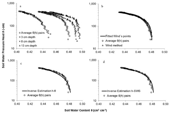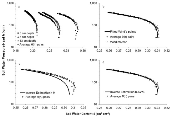 The results from assessing the validity of the Wind method and the HYDRUS inverse estimation for estimating the SWRC in a silty loam repacked stone-free soil column are shown in Figure 3. For the three soil depths, θ(h) pairs as well as the average θ(h) set are depicted in Figure 3a. At the 3 cm depth, the soil water content was lower at the same h value than at the 8 and 13 cm depths. The θ(h) points resulting from averaging measurements from the three soil depths were closer to points representing the lower depth compartments.