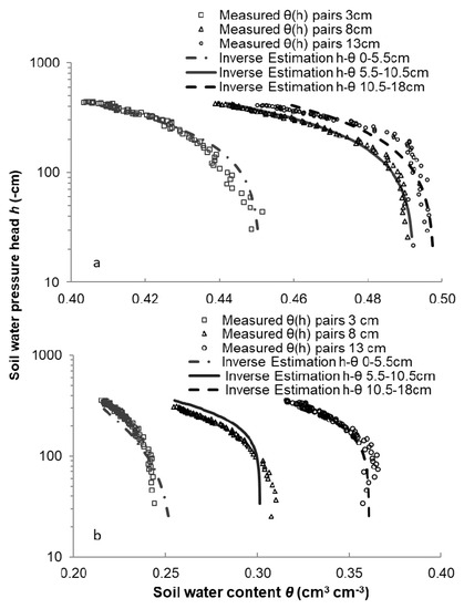 In the next step, the inverse estimation was performed for the three depth compartments 0–5.5 cm, 5.5–10.5 cm and 10.5–18 cm independently, in the same fashion as for the stone-free soil. The results of this scenario are provided in Table 5. Assuming depth-specific soil hydraulic property functions improved the estimation results, and the differences between predicted and measured water content were reduced. Figure 4b shows the agreement between the θ(h) points measured for every soil depth and the water retention curves shape obtained by inverse parameter estimation (estimation h-θ) when soil compartments were analyzed separately.