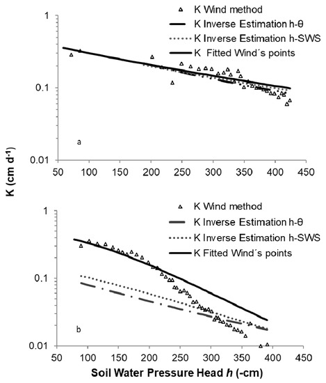 The unsaturated hydraulic conductivities determined by the different methodological approaches, considering the soil as a uniform column, are shown in Figure 5a. For the Wind method, no results for K could be obtained in the wet range as long as the threshold value of 0.3 cm cm−1 for the hydraulic gradient was not passed. Therefore, K(h) are only represented for the range of h < –50 cm. Unsaturated hydraulic conductivity functions obtained via parameter optimization with both inverse estimation scenarios (h-θ and h-SWS) were similar to the K(h) function obtained by the analytical description of the Wind method using RETC.