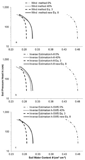 Comparison of the soil water retention curves obtained for the different data sets studied from the stone-free cylinder, stony cylinder and obtained data set using Equations (3) and (8) for (a) Wind method, (b) inverse estimation scenario h-θ, (c) inverse estimation scenario h-SWS.
