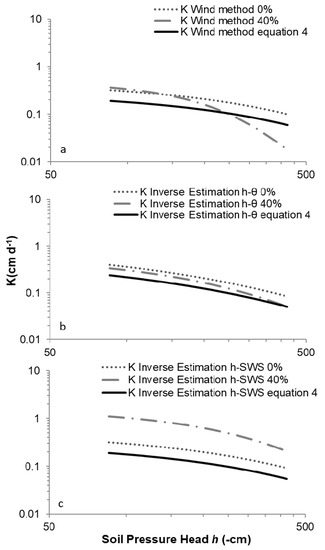 Regardless of the methodological differences (see above in Section 3.2), two common features of the K(h) curve of the stony cylinder can be observed in Figure 8. First, the values of K derived from the stony (40% stones) and stone-free (0% stones) cylinders measurements in the higher range of pressure head values (h) were systematically higher than those derived from Equation (4) for the three different approaches. Second, the shape of the K(h) curves obtained for the stony cylinder denoted a faster decrease of K values with decreasing soil water pressure head than both K(h) curves from the non-stony cylinder and the curve determined using Equation (4).