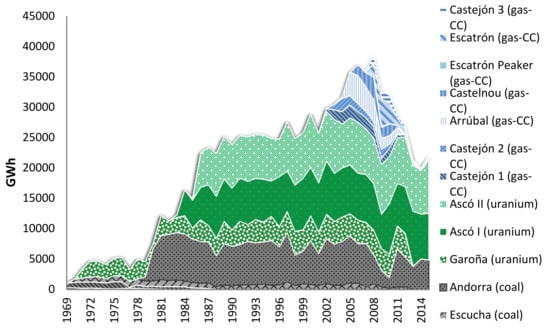The Ebro River basin makes the largest water contribution of all the basins to the country’s electricity generation, considering all the generating technologies, including hydroelectricity. The use of water for hydropower generation has been analyzed [45]. However, the volume of water needed for thermoelectricity has been overlooked in the literature. Looking just at thermoelectricity, there are eight conventional thermal and nuclear power plants operating in the Ebro River basin, the first dating from the 1950s. There are isolated cases of thermal power stations prior to 1950, but they had a very local characters as they were dedicated to supplying electricity to mining installations and villages. This is the case for the Utrillas and Ariño thermoelectric power plants in Aragon (See [46], pp. 240–248). Figure 1 shows the locations of the thermoelectric plants (conventional and nuclear) in the basin. The great variety of generation technologies, and different cooling systems, installed in the facilities make the Ebro River basin especially appropriate for assessing the freshwater needs of thermoelectric power generation.