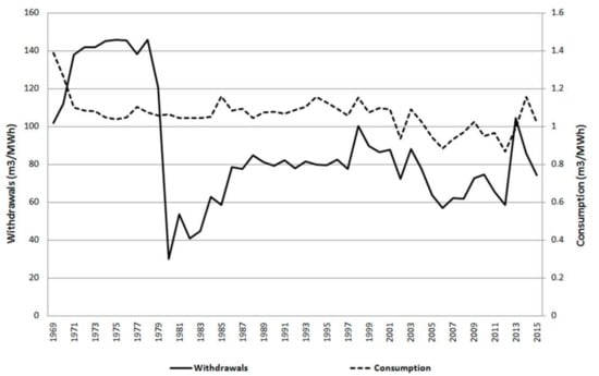 Evolution of technological water intensity in terms of water withdrawals (left axis) and water consumption (right axis) of thermal power stations in the Ebro River basin, 1969–2015. Note: The Escucha and Castelnou coal-fired power stations-using air-cooled condensers-are excluded. Source: own design (see ’Data File S1’ in Supplementary Materials).