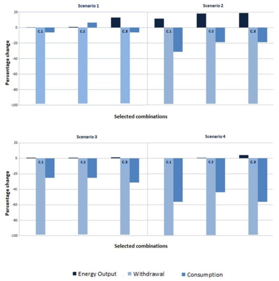 This scenario covers the three best combinations of coal-fired and combined-cycle power plants (see Table 5) which, operating at maximum capacity, can reach an output equal to or greater than 16,240 GWh, while consuming little water. Therefore, this set of power plants would be enough to cover predicted electricity supply if the existing nuclear power plants in the Ebro River basin closed down.