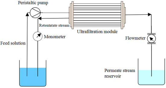The experimental setup is shown in Figure 1. This includes a membrane pump, a pipeline, a pressure gauge and an ultrafiltration membrane. The equipment’s technical parameters and the main performance parameters of the ultrafiltration membrane are shown in Table 1 and Table 2, respectively.
