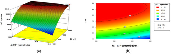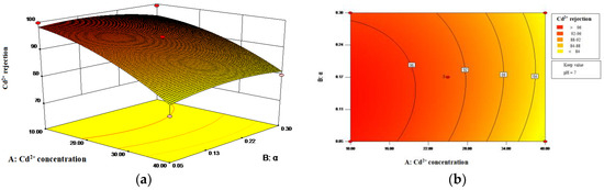 Response surface (a) and isolines (b) for the Cd2+ rejection rate, the Cd2+ concentration and α.