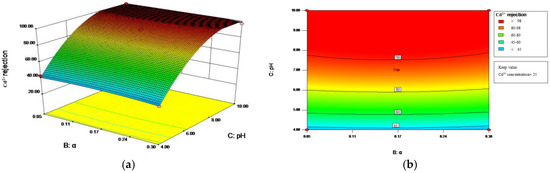 Response surface (a) and isolines (b) for the Cd2+ rejection rate, α and the pH.