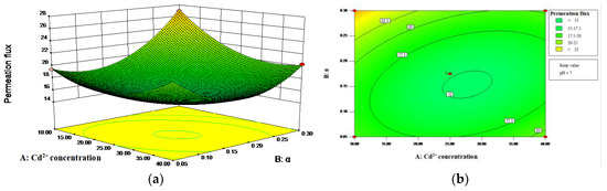 Response surface (a) and isolines (b) for the permeation flux, the Cd2+ concentration and α.