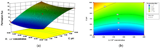 According to the F values in Table 7, the factors’ impacts on the permeation flux are in the following order: Cd2+ concentration < α < pH. In addition, the P values in Table 8 show that the effects of α and the pH on J are extremely significant; the effect of the Cd2+ concentration on J is insignificant; that the effects of the quadratic terms (A2, B2 and C2) of the Cd2+ concentration α and the pH on J are extremely significant and that the effects of the interactions between the Cd2+ concentration and α (AB), and between α and the pH (BC), on J are very significant.