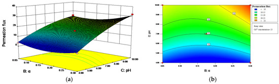 Response surface (a) and isolines (b) for the permeation flux, α and the pH.