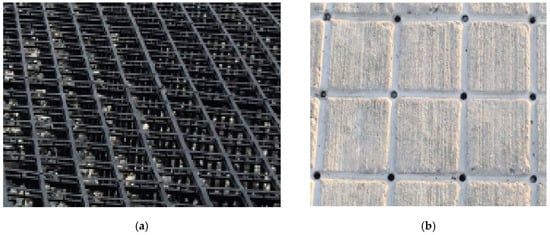 In addition to the common permeable pavement systems mentioned, the JW Eco-technology also recently gained attention. The JW Eco-technology pavement has been described in the literature as a load-bearing pavement because of its unique structure and design [,,]. The JW Eco-technology product was first installed in the USA at the University of Illinois (Urbana-Champaign) in 2016, and it may provide a permeable pavement alternative that has the necessary structural strength needed for roadways, while also providing stormwater management and other environmental benefits. JW Eco-technology was developed in Taiwan by Mr. Jui-Wen Chen. JW refers to the initials of the inventor’s first name. It has become an option to replace impervious concrete in many areas of Taiwan and China [,]. In Taiwan, a 10-year guarantee for the evenness and smoothness of the JW pavement is provided by the inventor []. JW Eco-technology combines the use of plastic frames and concrete to form its structure. Each unit of air-circulating aqueduct frame made of polypropylene (PP) forms the basic structure. Individual units of the frame are installed and leveled across a desired area, and concrete is then poured and evenly leveled over the frame. Each frame unit is covered by a plastic frame lid, so that the aqueduct openings will not be blocked when pouring concrete. The lid is peeled off when the concrete dries. After this procedure, the aqueduct frame is embedded in the concrete, which provides some reinforcement to the concrete. Figure 1 demonstrates an example of a completed JW Eco-technology unit.