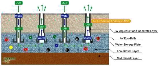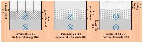 The air-circulating aqueduct openings are evenly distributed among the concrete unit, approximately 100 pores per square meter [,]. The interior of each aqueduct surface is smooth, to allow surface water to flow directly along the interior wall downward to the subsurface layer. The JW Eco-technology prevents the occurrence of lateral flow that is seen in most permeable pavement systems []. Depending on the location and objective of a paved area, the design of the pavement using JW Eco-technology may vary. In general, the JW Eco-technology pavement is composed of a layer of the JW Eco-technology paving surface on top, and an underlying layer of gravel with designated thickness, and below are the soil base layers as shown in Figure 2. A prescribed number of JW Eco-balls, or plastic hollow balls that increase the storge capacity of water, are distributed throughout the gravel layer.