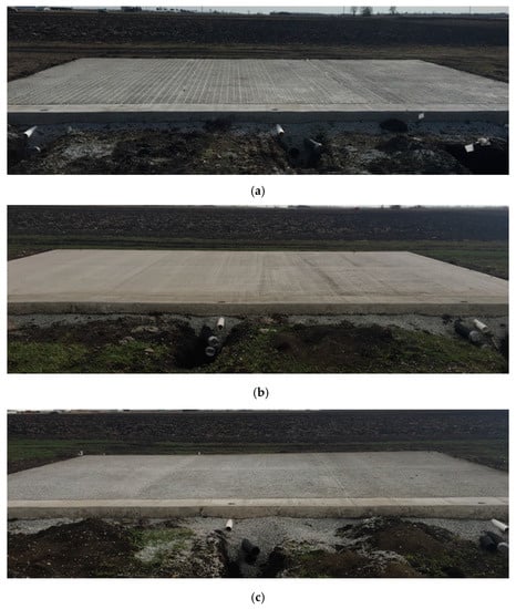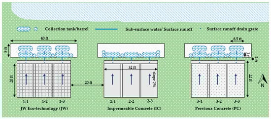 The study site includes three pavement systems; pervious concrete, conventional impermeable concrete, and the patented JW Eco-technology method, and each is in triplicate for nine total pavement pads. The dimensions of each pavement pad are 6.10 m × 3.05 m (20 ft × 10 ft) with a 0.305 m (1 ft) buffer strip between the three replicates of the same paving material. Therefore, the existing triplicate pads with the same materials appear as a whole slab; however, the surface and subsurface drainage water are kept separate for each of the three pads by a small surface barrier and a visqueen liner, respectively. The orientation of each pad is in a north–south direction, with a 2% slope from south to north, which will drain surface water to the collection units. The distance between pavement types is 6.10 m (20 feet). There are two perforated tiles beneath each pavement plot (three plots per pavement pad), one at the designated soil layer, and the other at gravel layer, under each of the nine pads. The tiles direct subsurface water to the collection equipment. In addition, there is a 9.75 m × 0.61 m (32 ft × 2 ft) concrete v-trench with three drainpipes at the north end of each paving slab. These trenches allow the surface water on each pad to flow to the outlet drain and then to the collection tank. The overview of the installed pavement site is illustrated in Figure 4.