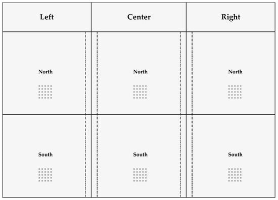 There have been no regular traffic loadings, so that the maintenance plan so far was to remove obvious substances on-site with the routine use of a leaf blower. The investigation of permeability was performed on sunny days when there was no rain within the previous 24 hr, and also no standing water on top of the pavement pads. The NCAT and ASTM methods were performed during August and September 2018, while measurements using the square frames (SF) were conducted in October 2018. The same test locations were used for all permeability testing methods. The measurements of field permeability of the three pavements were performed on the north and south sections of each pad, locations of which are shown in Figure 8.
