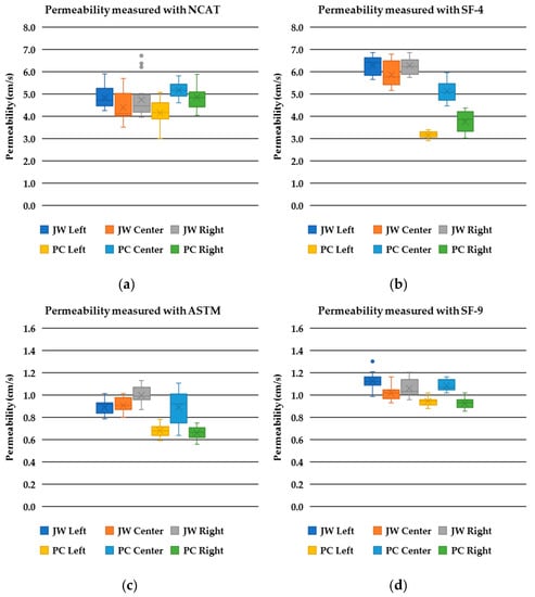 Descriptive statistics with the aid of box-and-whisker diagrams of the permeability measured with (A) NCAT (falling head), (B) SF-4 (falling head), (C) ASTM (constant head), and (D) SF-9 (constant head). Note the y-axis values for (A) and (B) range from 0–8 cm/s, while the values for (C) and (D) range from 0–1.6 cm/s.