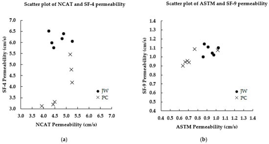 Scatter plots of permeability obtained by (a) NCAT and SF-4 methods, and by (b) ASTM and SF-9 methods on the north and south test locations on the JW and PC pavements.