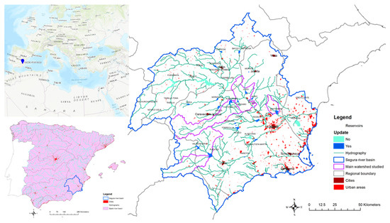 Location of the studied reservoirs in the Segura River Basin (SRB), southeastern Spain.
