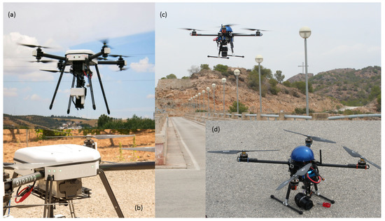 OpenSource equipment developed by Droning to carry out the photogrammetric work: (a,b) Droning D-820; (c,d) initial design based on Droning D-650.