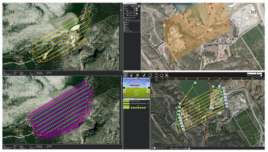Waypoints definition, using Mission Planner software, in the Valdeinfierno reservoir (a) and the Santomera reservoir (d), ground control points in the Santomera reservoir (c) and centers ortofo in the Valdeinfierno reservoir (b).