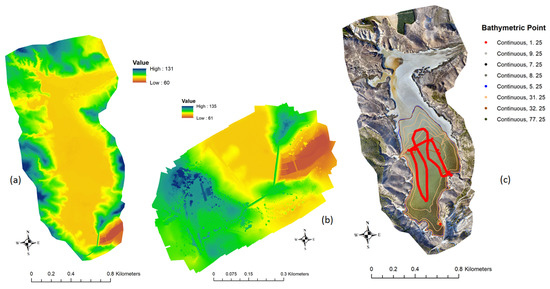 (a) Digital terrain model for a spatial resolution of 20 cm, (b) Digital terrain model for a spatial resolution of 5 cm, and (c) a bathymetric survey in Santomera reservoir at a spatial resolution of 1 m. The height is referred to the sea level in Alicante.