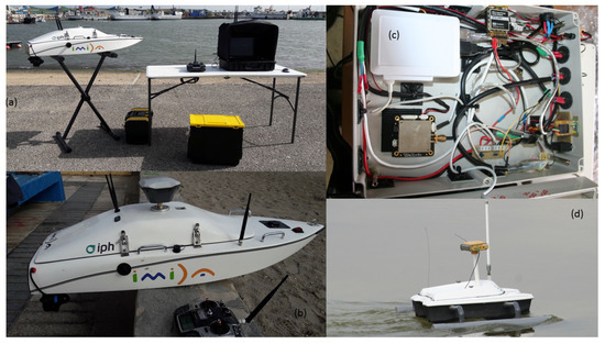 OpenSource equipment developed by Inntelia Soluciones Tecnológicas S.L. (IPH) for the topo-bathymetric work: (a–c) Mambo-IMIDA; and (d) the initial design based on Mambo-IPH.
