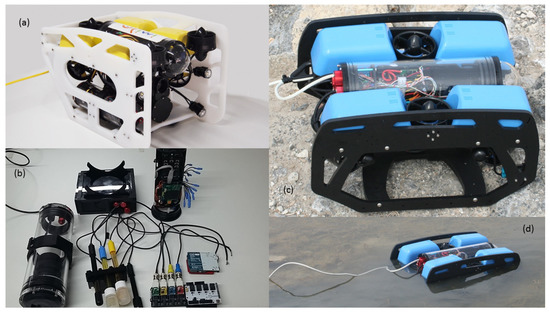 OpenSource equipment developed by Nido Robotics S.L. for the topo-bathymetric work: (a,b) SIBIU-IMIDA; and (c,d) initial design based on BlueRov2 (Blue Robotics In., Torrance, CA, USA).