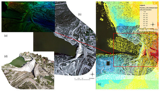 LiDAR data (a), orthophotography (b), bathymetric and LiDAR data (c), and 3D model (d) of the Puentes reservoir. The height is referred to the sea level in Alicante.