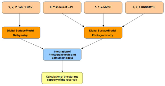 The photogrammetric and bathymetric data were integrated in an ArcGiS 10.5 geodatabase containing the LiDAR data of each reservoir. Using all the data, a digital elevation model was generated with a spatial resolution of 1 m, to perform the cubing for each isobath (m) and thus to compute the volume (m3) for each reservoir. The volume between each isobath was calculated, starting at the deepest level and finishing at the isobath corresponding to the maximum level of the reservoir. The final result corresponds to the height–volume relationship that is the current capacity curve. The applied methodology is represented in the flowchart of Figure 8.
