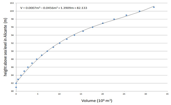 Height–volume curves in the Santomera reservoir. The height is referred to the sea level in Alicante.