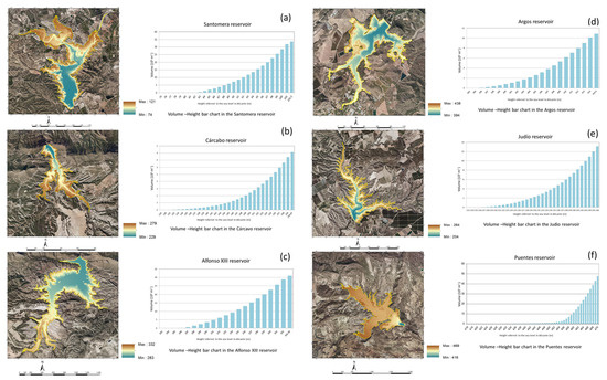 Digital terrain model and height–volume bar graphics for the Santomera (a), Cárcabo (b), Alfonso XIII (c), Argos (d), Judío (e) and Puentes (f) reservoirs. The height is referred to the sea level in Alicante.