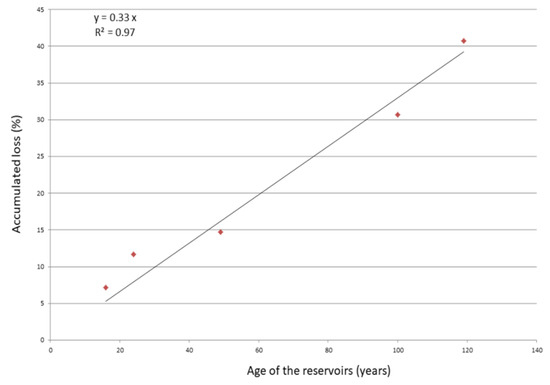 The accumulated storage capacity loss data of the most representative reservoirs of the basin as a whole are summarized in Table 7. Cárcabo had the highest annual rate of storage capacity loss (0.49%), although it is not the oldest reservoir. Valdeinfierno reservoir (119 years old) exhibited the highest accumulated storage capacity loss (40.77%), with an annual loss rate of 0.34%. Figure 11 presents the relationship between the accumulated loss and the age of the five representative reservoirs (included in Table 7).