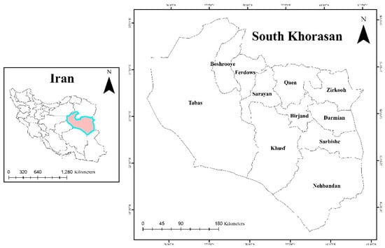 South Khorasan province is located in the east of Iran and lies between 30°15′ N to 34°03′ N latitudes and 57°43′ E to 61°04′ E longitudes with almost 151,193 square km area and 768,898 inhabitants. Birjand, Boshrooye, Darmian, Ferdows, Khusf, Nehbandan, Qaen, Sarayan, Sarbishe, Tabas, and Zirkooh are the 11 counties of the province as shown in Figure 1. This province accounts for almost 9 percent of Iran’s territory and is the third biggest province in the whole country. Temperature is ranging from −13.57 °C to 46.83 °C with a dry and hot summer. Spatial pattern of precipitation in this region varies between 89 mm in Tabas to 186 mm in Qaen. Temporal distribution of precipitation is even more uneven. Most of the annual rainfall occurs from January to April. As the province is located near one of the hottest deserts in the world (Dasht-e Lut), low relative humidity is a common feature of this region with 10 to 58 percent. The east (Tabas) and south (Nehbandan) part of the province are the driest parts and Qaen in the north has the highest humidity. The dominant wind direction is north to south with speed of up to 6.5 m/s. Due to the high temperature values during the year alongside the moderate wind speed values, the evapotranspiration amount is high ranging from 964 mm to 1552 mm per year in the study region.