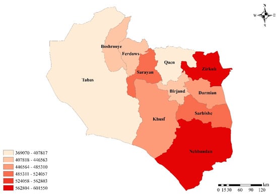 The contribution of available renewable water resources of each county is quantified using the isohyet lines from the long-term precipitation data. Unfortunately, the data of water availability for the period of 2005 to 2010 was not available in the Regional Water Company of South Khorasan province, and therefore, only the available data for the period of 2011 to 2014 was used in this study. The amount of water withdrawal along with the available water of 11 counties of the province is presented in Table 5. According to this table, Boshrooye had the largest water usage with the average of 221.43 × 106 m3 annually. Qaen and Sarayan were the next largest water users with an average withdrawal of 195.51 × 106 m3 and 173.17 × 106 m3, respectively. On the other side, Khusf and Tabas used the least amount of water in crop productions with 28.72 × 106 m3 and 31.05 × 106 m3, respectively.