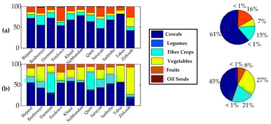 The proportion of each type of crops based on their cultivation areas along with the amount of production is depicted in Figure 4. As shown in this figure, with a share of 7% in cultivated lands, vegetables account for 27% of crop production. At the province-level, cereals are the major type in both cultivated lands (61%) and crop productions (45%). This amount of production has led to export the surplus of 24,117 tonnage annually. It means that 68.31 × 106 m3 water transferred annually outside the boundaries of the province. However, the South Khorasan province is a net virtual water importer with regard to the other five crop types. Based on the results of this study, these five crop types are responsible for importing 936.87 × 106 m3 water from outside the province. As shown in Figure 5, fruits have the largest share of the virtual water imported to the province with 423 × 106 m3 annually.