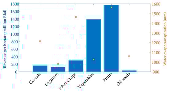 Figure 6 provides a comparison between water evapotranspiration and average revenue per hectare of different crop types. From 2005 to 2014, the total water that used in the production of cereals, legumes, fiber crops, vegetables, and oil seeds decreased by 25% or 217.06 × 106 m3. The irrigation water consumed in fruits, though, increased dramatically by 148% or 251.00 × 106 m3. This reallocation of limited water resources to water-intensive crops like fruits resulted in increasing water withdrawal during this period (Figure 9). Regarding the depicted results in Figure 6 along with the results shown in Table 3, vegetables are the most environmentally (low TVW) and second economically (high revenue per hectare) sustainable category. Therefore, it is worth to increase the cultivation area of this crop type. By applying this crop pattern, farmers would gain more profit by using the same amount of water or even less.
