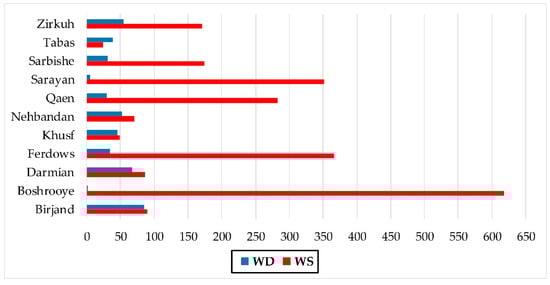 In terms of sustainability, nine counties put their valuable and limited groundwater resources in grave danger of deprivation. Ferdows, Boshrooye, and Sarayan continued to rely heavily on their groundwater aquifer systems as a result of self-sufficiency policies without considering the limited water resources (Figure 8). South Khorasan province has suffered the consequences of this mismanagement. Drying up lakes and wetlands, land subsidence and sinkholes, water quality degradation, desertification, coming down the groundwater levels, soil erosion, and dust storms as environmental consequences and losing lots of jobs, migration to towns, and suburban sprawl as social ones were prompted as a result of the condition of insecurity [].