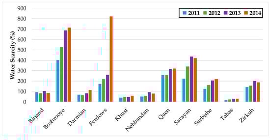 The proportion of crops transferred within the province are depicted in Figure 5 either the crops imported to or exported from the counties. Cereals were the largest type of crops which either exported from or imported to the counties. Birjand, Darmian, and Zirkuh imported around 65.7% of the cereal productions of other counties annually and the remains were exported outside the province, including about 24,117 tonnage of cereals which is equivalent to 68.31 × 106 m3 of water. According to the values of WS of the counties, as shown in Figure 8, this situation was not environmentally sustainable. In other types of crops the province was net virtual water importer and all the virtual water exports in them were interregional. This amount of imported water was not enough to alleviate the enormous pressure exerted on the groundwater aquifers as the average WS in the South Khorasan province was 206%.