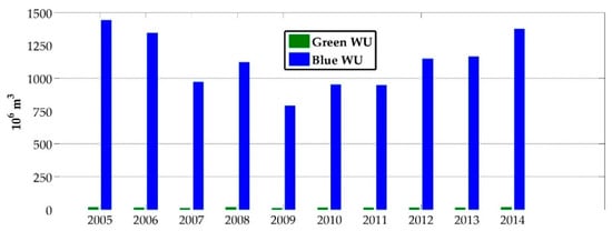 The variation of green and blue water use (WU) in the province from 2005 to 2014.