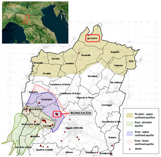 Figure 1 provides a planimetric view of the aquifers of interest, together with the location of the well fields. The hydrogeological unit of the Enza River extends from the Apennines towards the floodplains, and consists of alluvial deposits, mainly of gravel in the southern part, and an alternation of gravel and clay in the northern zone. It is the venue of the major well fields for the WSNs of the Reggio Emilia Province, namely Quercioli, Roncocesi, Caprara, and S. Ilario Nuovo. From the hydrochemical point of view, the aquifer is characterized by good water quality. Despite the intensive agricultural activity in the area, the concentration of nitrates is below 50 mg/L. Ammonia is absent, while the presence of iron and manganese is observed locally, in particular in the phreatic compartment, in the municipalities of Montecchio, Bibbiano and S. Ilario d’Enza, and in the lower confined compartment, in the hamlet of Roncocesi, near Reggio Emilia [34].