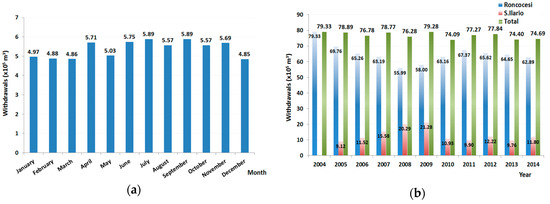 (a) Monthly trend of withdrawals from the Roncocesi well field in 2013; (b) Annual volumes of groundwater extraction from the Roncocesi well field, with the contribution of S. Ilario Nuovo (2004–2015).