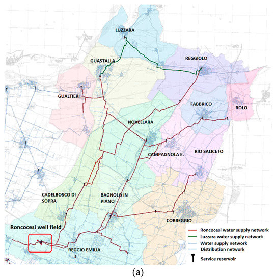 (a) Districts served by Roncocesi and Luzzara networks; (b) Schematization of Roncocesi and Luzzara networks, with main components.