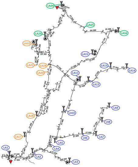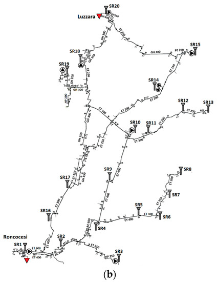 According to data reported in [37], the WSNs of Roncocesi and Luzzara have an extension of 1110.32 km and 23.80 km, respectively. Total length of pipelines is equal to 810.69 km in Roncocesi and 165 km in Luzzara WSNs. Two important parameters describing the efficiency of water supply and distribution networks are the mileage efficiency degree, i.e., the average number of inhabitants served per km of aqueduct, and the compactness of the network, i.e., the km of network referring to a single supply point [37]. High values of mileage efficiency degree indicate functional distribution networks that allow serving several users with few pipelines, while a high compactness index indicates the presence of well-branched networks, with few collection points.