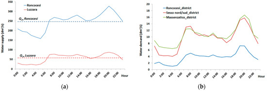 (a) Average hourly water supply (dm3/s) introduced in Roncocesi and Luzzara networks by the main reservoirs; (b) Average hourly water demand (dm3/s) from Roncocesi, Sesso, and Massenzatico localities. These flows are derived over the day of highest consumption, i.e., 15 July 2013.