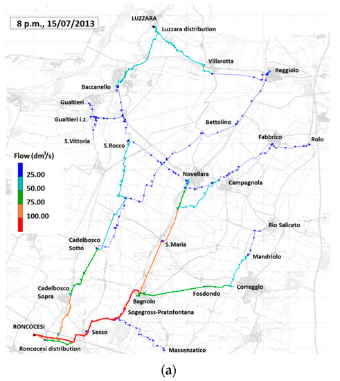 Hydraulic simulations of Roncocesi and Luzzara water supply systems over the day of highest consumption, i.e., 15 July 2013 at 8 p.m. (a) Flows, and (b) velocities inside the networks.
