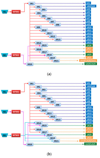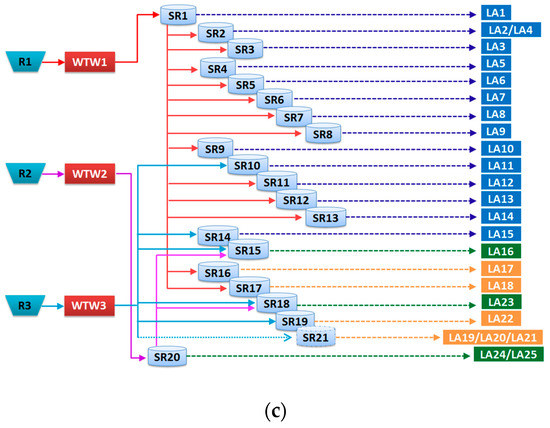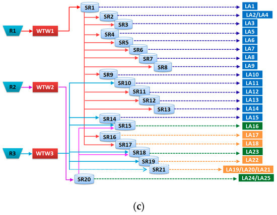 For the BAU, as well as for the two alternative strategies, the water demand related to each resource is assessed with WM2 through a mass balance based on average per capita water consumption data, associated with each LA, EPANET simulations and available water consumption reports [45]. The first step of modelling is the definition of the SCs in the area of interest, and in particular of the LAs, i.e., localities and districts served by the Roncocesi and Luzzara aqueducts. In this analysis, LAs, reported in Table 3, are shown in Figure 9, with different colors according to the SC. Three different SCs are identified in the area of interest. Here, a new “dummy” SR (SR21), with no energy and chemicals used, is added, in order to serve LA19, LA20, LA21. Water allocation coefficients, namely split coefficients, between the upstream and downstream components (e.g., WTW-SR or SC-SR), are necessary to define the topology of the system. In particular, these coefficients are used if two or more components (e.g., service reservoir) supply water to a downstream component (e.g., sub-catchment) [46]. Table 6 lists the split coefficients between the SCs and SRs, as derived from EPANET simulations and technical reports provided by the water company. These values do not change in all the intervention strategies.