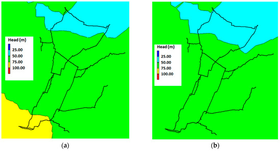 Contour plots of the total head over Roncocesi and Luzzara networks. (a) Total head at 10 a.m. (b) Total head at 8 p.m.