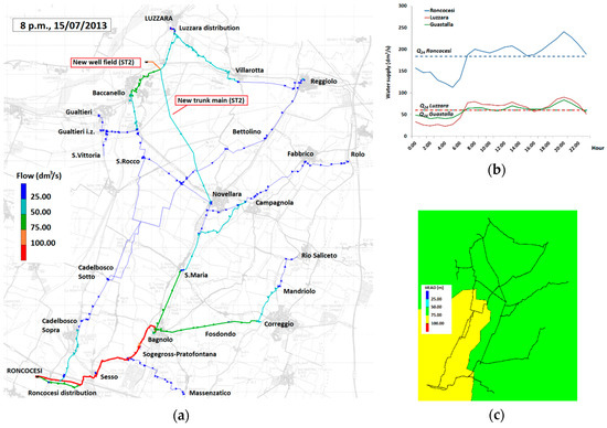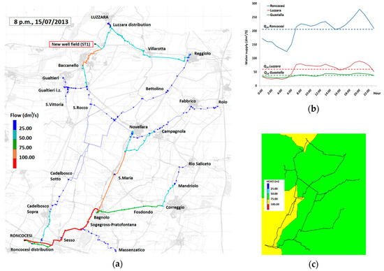 Hydraulic simulations of ST1 over the day of highest consumption (15 July 2013). (a) Flows derived at 8 p.m. (b) Average hourly water supply (dm3/s) introduced in Roncocesi, Luzzara, and Guastalla networks by the main reservoirs; (c) Contour plot of the total head over the networks at 8 p.m.