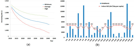 The LAs in WM2 are described by the number of inhabitants and properties, which are derived from data provided by the Water Company IREN, and ISTAT [38,45]. The per capita indoor water demand is assessed for each LA, and the variation of the demand is assigned over the defined time horizon. The annual population increase rate assumed for the analysis represents a medium growth scenario, derived by ISTAT [38], as depicted in Figure 10a. Variation of the indoor water demand follows the population growth on a yearly basis, according to available predictions; in addition, monthly coefficients are applied in order to mimic seasonal variations [47].
