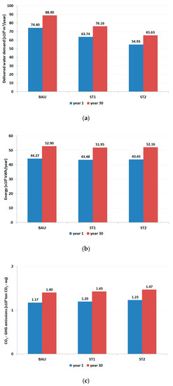 In order to compare the different strategies analyzed, results in terms of water balance, energy consumption and chemical usage have been investigated. Figure 13a shows the delivered water demand from the Roncocesi well field, under the three intervention strategies of interest, confirming the expected reduction in water withdrawals from the Enza fan, resulting from the inclusion of the new well field. These results are depicted for the first and last year of simulation. It is possible to observe that the decrease of 14% (ST1) and 26% (ST2) is maintained over the entire simulation period. At the same time, the increment in the delivered water demand in time, assumed to equal 20% over 30 years, and corresponds to the increment in the indoor water demand that is affected by population growth, while the industrial and commercial demand is supposed to be constant over the entire simulation period. This in turns causes an increase of 12% of the total water demand in the UWS.
